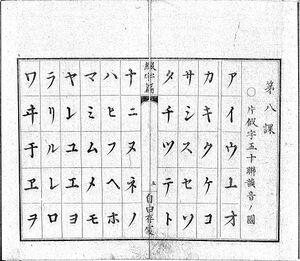 - ^ Roy Andrew Miller (1966) A Japanese Reader: Graded Lessons in the Modern Language, Rutland, Vermont: Charles E. Tuttle Company, Tokyo, Japan, p. 28, Lesson 7: Katakana: a—no. "Side by side with hiragana, modern Japanese writing makes use of another complete set of similar symbols called the katakana."