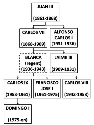 The regnal numbers are those used by their supporters. While they were not proclaimed kings, they made use of some titles associated with the Spanish throne.[بحاجة لمصدر]