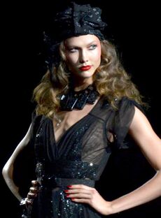 In 2012, Kloss was featured on the September covers of British Vogue,[50] Japanese Vogue,[35] Harper's Bazaar Russia,[51][52] and Numéro.[53] She appeared in campaign ads for Juicy Couture,[54] Stefanel,[55] Elie Saab,[56] and Jean Paul Gaultier.[57][58] She co-hosted the revival of the MTV series House of Style with fellow model Joan Smalls.[59] Just before appearing in the Victoria's Secret Fashion Show in 2012, Kloss had her long hair cut into a bob, which was subsequently called the "Karlie".[60][61] One of her outfits was cut out of the Victoria's Secret broadcast as it contained a Native American headdress that was deemed offensive.[62]