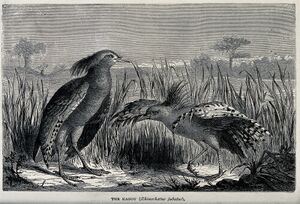 The species was not discovered by Europeans until the French colonisation of New Caledonia in 1852 and was not described until a specimen was taken to the Colonial Exhibition in Paris in 1860.[18] This led to a surge in scientific interest in the species, which resulted in many birds being trapped for museums and zoos. The species was also trapped for food and was considered a delicacy by European colonisers. It was also fashionable to own kagus as pets. A campaign was run from 1977–1982 to phase out the pet trade in kagus. Today, the kagu is considered very important in New Caledonia; it is a high-profile endemic emblem for the territory. Its distinctive song used to be played to the nation every night as the island's TV station signed off the air. Its survival is considered important for the territory's economy and image.[5]