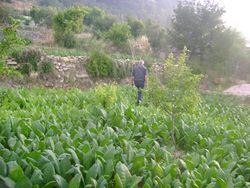 تتسم أراضي القرية بصعوبتها ولكن الفلاحين قاموا بتحويلها إلى مدرجات جبلية فوق السفوح حفاظاً على تربتها ومنعها من الإنجراف واستنبتوا منها ما لذ وطاب. حيث تجد فيها بساتين اللوزيات والكرز والتفاح بالإضافة إلى إنتشار أشجار الجوز والتين والعنب والتوت, وكانت القرية تعتمد في السابق بشكل كبير على تربية دود القز الذي يتغزى على أوراق شجرة التوت وكان هذا المحصول حتى وقت قريب يعد محصولاَ أساسيا في القرية, أما في السنوات القليلة الماضية فبدأ الفلاحون بزراعة الزيتون بشكل كبير وهناك حالياُ الكثير من الأهالي الذين ينتجون زيت زيتون للبيع والذي يمتاز بمواصفات عالية الجودة إلى جانب المذاق الرائع. كما يزرع الفلاحون التبغ والذي يعد من أحد أهم المحاصيل التي تؤمن دخلا معقولاً لأهالي القرية. بالإضافة إلى ذلك تنتشر زراعة الحبوب الشتوية لا سيما القمح وتزرع الخضر ريا في البساتين القريبة والمحيطة بالينابيع. تبلغ المساحة الزراعية للقرية حوالي 300 هكتار والتي كانت تحرث قديما بواسطة الحيوانات (مثل الحمير والأبقار) وأما حالياً فتتم حراثة هذه الأراضي بواسطة ما يعرف في القرية بالعزاقة حيث بالكاد يخلوا بيت منها وقام أهل القرية بتطويرها ليستخدموها في تنقلاتهم.