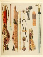 Mandau and Talawang are the main traditional weapon of Dayak people in Central Kalimantan. Mandau is a type of sword with single edge blade i.e. one side is convex and the other side is concave. Mandau consists of three different parts, those parts are Bilah or the blade that made of Mantikei iron plate with sharp edge and 70 cm long, Pulang Gagang or the hilt that usually made of wood, deer's horns, or even human bones, and Sarung or the sheath which cover the blade that typically made of wood and usually covered with bracelet-shaped bone on the upper part and wrapped by rattan rope.[30]