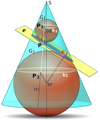 Using the Dandelin spheres, it can be proved that any conic section is the locus of points for which the distance from a point (focus) is proportional to the distance from the directrix.[7] Ancient Greek mathematicians such as Pappus of Alexandria were aware of this property, but the Dandelin spheres facilitate the proof.[6]