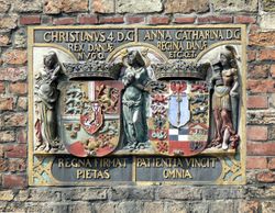 ![]() Coat of arms of Christian IV and Queen Anne Catherine. From Kompagnietor, Flensburg. |