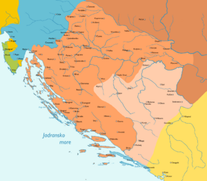 Paul issued his own money and was for all practical purposes an independent ruler. In 1311 Paul triggered a successful rebellion in Zadar against Venetian rule. War with Venice continued after Paul's death on 1 May 1312, who was succeeded by his son Mladen II. With Paul's death began a gradual decline of the Bribir Princes. Venice eventually restored their rule in Zadar in 1313.[71] In 1322 another civil war in Croatia started, culminating in the Battle of Bliska when Mladen II and his allies were defeated by a coalition of Croatian noblemen, including his brother Paul II, and coastal towns under the command of John Babonić, the Ban of Slavonia. A council in Knin was convened by the King where John Babonić was named Ban of Croatia and Dalmatia, ending the hereditary banship of the Šubić family. Their holdings were reduced and split between Mladen's brothers. Paul II held Bribir and Ostrovica, while George II held Klis, Skradin and Omiš.[73] After the decline of the Šubić family, Ivan Nelipić had risen to become the dominant figure in Croatia. He seized the royal city of Knin, which led to the removal of John Babonić from his banship and the appointment of Nicholas Felsőlendvai and later Mikcs Ákos, whose army was defeated in 1326 by Ivan Nelipić. Thus all of Croatia from Lika and Krbava to the Cetina River was in fact outside the king's authority. Nelipić had tense relations with the Šubići and had frequent conflicts with them. During these conflicts Venice took control over Split in 1327 and Nin in 1329, gaining most of the coast from Zrmanja River to the mouth of the Cetina. At the same time, Stephen II Kotromanić, Ban of Bosnia, annexed the territory between Cetina and Neretva, as well as Imotski, Duvno, Livno i Glamoč. Over the remainder of Croatia Ivan Nelipić ruled independently from Knin until his death in 1344.[73][74] Following that Louis I restored royal power in Croatia and pacified the country by the end of 1345. Nicholas Hahót was the first appointed royal official in decades, who styled himself Ban of Slavonia, Croatia and Dalmatia, merging the two positions and extending his influence to the Croatian territories as well to represent the royal authority.[75]