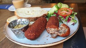 Rundvleeskroketten, Dutch croquettes containing a beef ragout, served with Doesburg mustard and bread