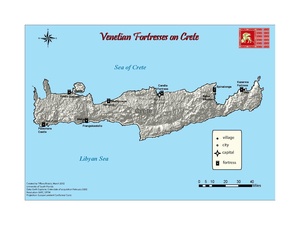 خريطة لأهم الحصون البندقية في جزيرة كريت، بنيت أثناء الامبراطورية البندقية والمقاومة.