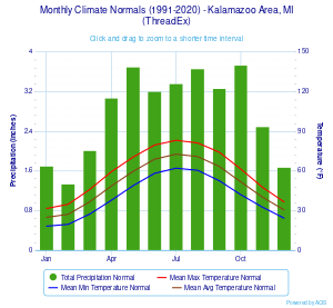 بيانات المناخ لـ Kalamazoo Battle Ck Intl Ap, MI, 1991–2020 normals, extremes 1887-present | |||||||||||||
