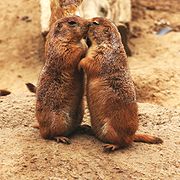 The highly social prairie dogs live in large colonies or "towns" – collections of prairie dog families that can span hundreds of acres. Families usually consist of 1 male and 2 to 4 females living in a strict social hierarchy.[1] Prairie dog pups reach sexual maturity at about 3 years of age, and after their third winter the dominant male in a given family will drive them away, forcing them to establish their own families on the edges of the colony. The dominant male will defend the family's borders against rival prairie dogs, and disputes are resolved by fighting. Prairie dogs are also aggressive against predators such as badgers and snakes. Prairie dogs are social animals, however, and often make social visits with each other, and greet each other with a sort of kiss.[2]