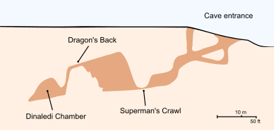 A portion of the cave, used by the excavation team en route to the Dinaledi Chamber, is called "Superman's Crawl" because most people can fit through only by holding one arm tightly against the body and extending the other above the head, in the manner of Superman in flight.[2][5]