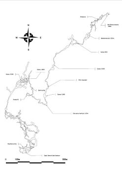 - August 2023 – the cave depth was increased to 2،223 متر (7،293 ft) through the survey of the siphon Captain Nemo's last stand by an underwater drone, again during the expedition of the PSC.[15]