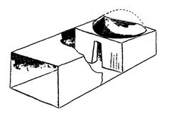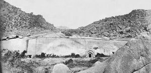 The Visvakarma cave, also called Viswa Mitra, is accessible by the "steps of Ashoka" carved into the cliff. It is a hundred meters and a little east of the main granite hill 25°00′22″N 85°03′53″E / 25.00611°N 85.06472°E. It consists of a rectangular room entirely open to the outside, a sort of elongated porch, and an unfinished semi-hemispherical room: the rectangular space measures 4.27x2.54m, and the circular room is 2.8m in diameter . One goes from the rectangular room to the half-hemispherical room by a narrow trapezoidal passage. On the floor of the porch, four holes were made, which are thought to allow the cave to be closed with a wooden picket fence.[7]