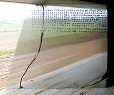 Karan Chaupar, also known as Karna Chaupar, is on the northern side of the Barabar granite hill. It consists of a single rectangular room with polished surfaces, 10.2x4.27m in dimensions. It contains an inscription of Ashoka dating from the 19th year of his reign, about 250 BCE, located outside, immediately to the right of the entrance.[19] Initially, it was thought from E. Hultzsch's 1925 translation, that Ashoka's inscription from Karna Chopar Cave does not mention the Ajivikas, and seems rather to refer to the Buddhist practice of retirement (vassavasa) during the rainy season. In addition, the inverted swastika with upward arrow at the end of the inscription (