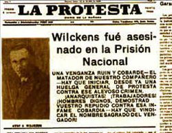 في 15 يونيو 1923، قُتل كورت ڤيلكنز في السجن على يد إرنستو پيريز ميلان تمپرلي، أحد أعضاء الرابطة الوطنية الأرجنتينية. بعد سنتين، في 9 نوفمبر 1925، توفي تمپرلي بعد أن هاجمه سجين آخر، إستبيان لوسيتش، الذي كان يعمل بأوامر من الأناركي الروسي بوريس والديميروڤيتش.