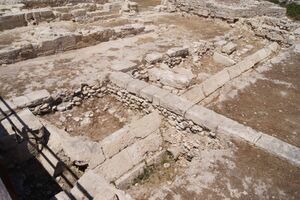 The remains of a Hellenistic public structure, approximately 30 m in length are located 30 m southeast of the nymphaeum. This structure was used from ca. 325 to 50 BCE. Additional Hellenistic remains were uncovered in 1948/49 by the University of Pennsylvania Museum Expedition immediately east of the Complex of Eustolios in the form of black and white pebble mosaic.[26]