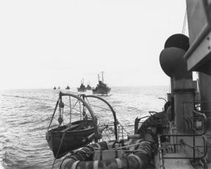 حراقات كندية تؤدي مهامها المضادة للغواصات لحماية قافلة أثناء الحرب العالمية الثانية