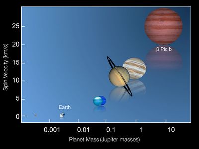 توقيع سرعة البرم الاستوائي مقابل الكتلة للكواكب يقارن Beta Pictoris b بكواكب المجموعة الشمسية. (ESO/I. Snellen (جامعة لايدن)