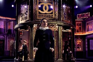 شريهان في أحد مشاهد المسرحية وخلفها العلامة التجارية لشانيل.