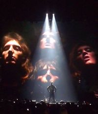 Robbie Williams, on stage in 2015 with the Queen image in the background, performed "We Are the Champions" for the 2001 medieval adventure film A Knight's Tale