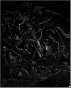 The motif of Chaoskampf (ألمانية: [ˈkaːɔsˌkampf]; حرفياً 'struggle against chaos') is ubiquitous in myth and legend, depicting a battle of a culture hero deity with a chaos monster, often in the shape of a serpent or dragon. Parallel concepts appear in the Middle East and North Africa, such as the abstract conflict of ideas in the Egyptian duality of Maat and Isfet or the battle of Horus and Set.[7]