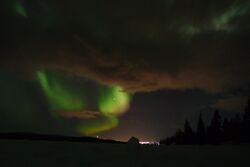 The coldest confirmed temperature ever in Kiruna was recorded at the nearby weather station with −43.3 °C (−45.9 °F) recorded in January 1999.[42] The weather station recorded 31.6 °C (88.9 °F) in July 1945, which is the all-time record.[43] The warmest month on record at the weather station was July 2018, with average high temperatures of 24.3 °C (75.7 °F).[44] Kiruna has a gloomy climate, affected by Atlantic low-pressure systems. Due to its extreme daylight cycle, the period between April to August account for 73% of Kiruna's annual sunshine according to the 1961-1990 normals, whereas the five darkest months between October and February contain only around 10% of the annual sunshine.