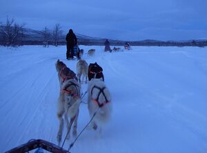 Although some tourists had already started coming to the area in the 19th century, the completion of the railway line truly made tourism possible. Tourists came for the rivers and the mountains, but also geologists and entire classes of students came to see the mine. Additionally, a yearly winter sports festival was started, which attracted people from a wide area. The Sami population was already a tourist attraction in the early days of Kiruna's existence.[17]