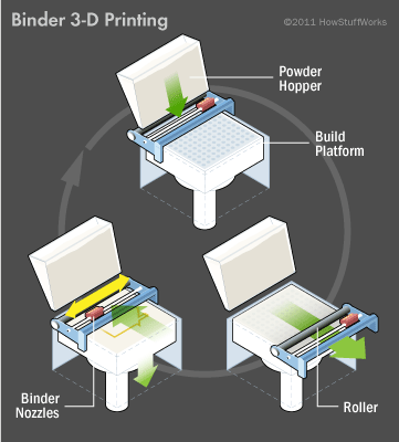 الطباعة بيندر 3-D ، مثل الطباعة المباشرة 3-D، تستخدم فتحات الحبر لنفث السائل وتشكل كل طبقة جديدة. على عكس الطباعة المباشرة، فإن الطباعة بيندر 3-D تستخدم اثنتين من المواد المنفصلة التي تأتي معا لتشكيل كل طبقة مطبوعة: مسحوق ناعم جاف بالإضافة إلى الصمغ السائل ، أو البيندر [المصدر: جيبسون، وآخرون.]. الطابعات بيندر 3-D تجعل المرور مرتين لتشكيل كل طبقة. مرور الأول تطلق طلاء رقيقا من مسحوق، ومرور الثاني يستخدم الفتحات لتطبيق البيندر أو اللاصق. منصة التشغيل من ثم تنخفض قليلا لاستيعاب طبقة جديدة من المسحوق، والانتهاء من العملية برمتها تتكرر حتى ينتهى النموذج.