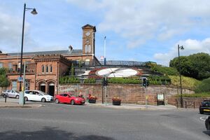 Archibald Finnie and his family lived at Springhill House (now a nursing home) near the Grange Academy. They owned many coal mines, pits and other companies in Springside and other places. John Finnie Street is named after one of the family. Shoes were also a major product for some time: Saxone had a factory in the town on the site where the Galleon Leisure Centre now stands and was the largest shoe production factory in operation in Scotland with a staff base of 1,000 employees at the plants peak.[36] Kilmarnock had one of the earliest tram railways in the world, running to Troon over the (recently restored) Laigh Milton viaduct. The Glasgow & South Western Railway set up their works here, producing nearly 400 locomotives by the time it was absorbed by the London, Midland & Scottish Railway in 1923. Some work continued, but heavy repairs were sent to St Rollox. Locomotive repairs finished in 1952, and the works closed in 1959. Nevertheless, locomotives are still made by Brodie Engineering, as well as the maintenance of existing diesel and electric multiple units. From 1949 self-propelled combine harvesters were built in Kilmarnock in a large Massey-Harris factory on the outskirts of the town. It later became Massey Ferguson, and closed in 1978. Glenfield and Kennedy still survives, albeit with a fraction of its former workforce, which at its height numbered in the thousands.