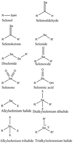 2−R, the selenium analogues of sulfones. - Selenenic acid (R−Se−OH) are intermediates in the oxidation of selenols. They occur in some selenoenzymes, such as glutathione peroxidase.