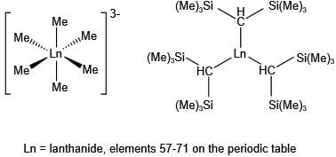 Metal-carbon σ bonds are found in alkyls of the lanthanide elements such as [LnMe6]3− and Ln[CH(SiMe3)2]3.[1] Methyllithium dissolved in THF reacts in stoichiometric ratio with LnCl3 (Ln = Y, La) to yield Ln(CH3)3 probably contaminated with LiCl.