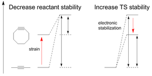 Computational efforts have been vital in explaining the thermodynamics and kinetics of these cycloaddition reactions which has played a vital role in continuing to improve the reaction. There are two methods for activating alkynes without sacrificing stability: decrease transition state energy or decrease reactant stability.