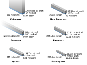 السفن من مقياس كيو-ماكس طولها 345 م وعرضها 53.8 م وإرتفاعها 34.7 م، وطول غاطسها 12 م.[9][10]