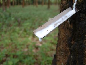 استخلاص اللاتكس من شجرة، للاستخدام في انتاج المطاط.