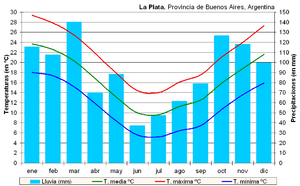 La Plata has a humid subtropical climate (Cfa under the Köppen climate classification).[12] During winter, temperatures are cool during the day and cold during the night, even reaching below freezing.[13] The average temperature in the coldest month, July, is 8.9 °C (48.0 °F). Winters tend to be cloudier than summer, averaging around 10 overcast days from June to August, compared to 6 overcast days from December to February.[13] Summers are warm to hot with a January high of 29 °C (84.2 °F) while nighttime temperatures are cooler, averaging 18 °C (64.4 °F). Spring and fall are transition seasons, featuring warm daytime temperatures and cool nighttime temperatures, highly variable with some days reaching above 32 °C (89.6 °F) and below 0 °C (32.0 °F).[13] The city is fairly humid, owing to its coastal location, having an average monthly humidity higher than 75%. La Plata receives 1،092 ميليمتر (43 in) of precipitation annually, with winters being the drier months and summer the wetter months. On average, La Plata receives 2,285 hours of sunshine a year, or 51% of possible sunshine, ranging from a low of 41% in June and July to 62% in February.[14] The highest temperature recorded was 41 °C (106 °F) on 14 January 2022 while the lowest temperature recorded was −5.7 °C (22 °F) on 14 June 1967.[15]