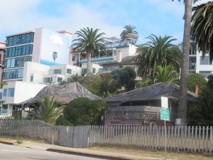 "Red Roost" and "Red Rest", two bungalow cottages built in 1894 on the road above La Jolla Cove. In recent years the cottages have been covered in tarpaulins.