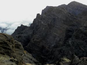There is a road that runs from Los Llanos de Aridane to the capital city of the island Santa Cruz de La Palma (known by locals as simply Santa Cruz). This road is a two-lane highway that includes a pair of two-lane tunnels that go right through the top of the mountain. The older tunnel is shorter (1،100 m (3،609 ft)) and higher than the newer tunnel (2،880 m (9،449 ft)). When traveling from one side of the mountain to the other it is common to enter one side in complete clouds (the east side) and come out to the sunny side (western side). This is due to the clouds not being able to cross the mountains, an effect caused by the counter trade wind.