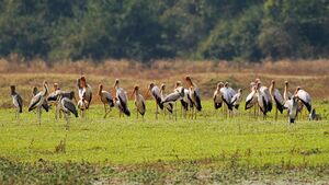 The yellow-billed stork may also begin nesting and breeding at the end of long rains. This occurs especially on flat extensive marshlands as water levels gradually decrease and concentrate fish sufficiently for the storks to feed on.[2] However, unseasonal rainfall has also been reported to induce off-season breeding in northern Botswana[17] and western and eastern Kenya. Rainfall may cause local flooding and hence ideal feeding conditions.[2] This stork appears to breed simply when rainfall and local flooding are optimal and hence seems to be flexible in its temporal breeding pattern, which varies with rainfall pattern throughout the African continent.[2]