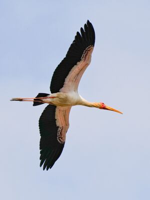 The species does not generally migrate far, at least not outside its breeding range; but does usually make short migratory movements which are influenced by rainfall. It makes local movements in Kenya and has also been found to migrate from North to South Sudan with the rainy season.[2] It may also migrate regularly to and from South Africa.[2] However, little is actually known about this bird's general migratory movements. Due to apparent observed variation in migratory patterns throughout Africa, the yellow-billed stork has been termed a facultative nomad.[2] It may migrate simply to avoid areas where water or rainfall conditions are unfavourable for feeding on prey.[2] Some populations migrate considerable distances between feeding or breeding sites; usually by using thermals to soar and glide.[2] Other local populations have been found to be sedentary and remain in their respective habitats all year round.[2]