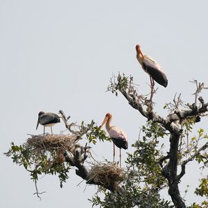 The yellow-billed ibis is a colonial nester, often alongside other species;[19] but the yellow-billed stork is sometimes the only occupant species of a nesting site.[2] Colonies are usually 10-20 nests in size, with several males occupying potential nest sites all in the same place.[2] If many of these males do not acquire mates, the whole group moves on with the unpaired females to another tree. These “bachelor parties”[3] are a noticeable feature of colonies of this species and usually consist of 12 or more males and at least as many females.[3] As many as 50 nests have been counted all at once in a single breeding area.[8]