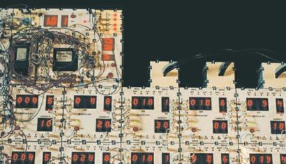 حاسوب يقاوم التحطيم: تمثل هذه الصورة منظومة ثنائية البعد لخلايا صنعية، تتألف كل واحدة منها من معالج بسيط. وفي هذا النوع من التطبيق تعمل أربع خلايا معا كساعة إيقاف stopwatch، وهناك خلية واحدة لكل رقم. تعد كل خلية إما حتى الرقم خمسة، أو حتى الرقم تسعة، ويتوقف ذلك على إحداثيات الخلية ضمن المنظومة. أما بقية الخلايا في المنظومة، فتعمل كقطع غيار احتياط تتولى المهمة مكان الخلية التي تخفق أو تقتَل. إن خلايا المنظومة المسماة بيوديول Biodule 601،التي تظهر في هذا الشكل، هي خلايا تأسست استنادا إلى بنية «الميكتري» الموصوفة في النص. |