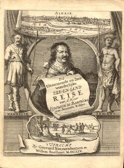 By his own account, Varthema gained his liberty after imprisonment both at Aden and Radaa because of a love affair with one of the sultanas of Yemen.[2] The sultana kept him in her palace at Radaa for a while. Eventually, feigning a malady, Varthema secured the sultana's permission to leave Radaa to seek out a cure with a specialist in Aden. He subsequently took a tour through south-west Arabia (claiming to have visited San‘a’), before finally returning to Aden again. The actuality of his visit to San'a and the accuracy of his observations have been questioned on the basis of, among other things, his uncorroborated description of the Sultan’s son being two dozen feet tall and inclined to bite people, kill them, and eat their flesh.[3]