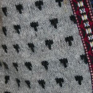The original sweater features a black and white design, the name referring to the isolated black stitches.[1] They may also feature selburose designs. In recent times additional color is sometimes given to this black and white sweater by woven ribbons or bands of black woolen fabric embroidered in the type of colorful designs also found in the bunads and in rosemaling around the neck and along the front opening. These front opening are usually closed by a row of pewter or silver clasps.