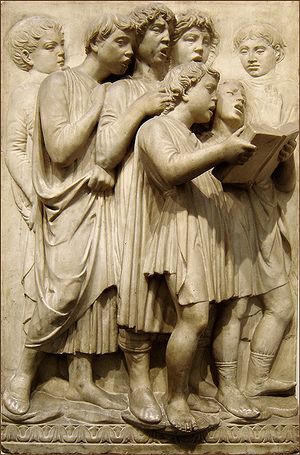 Cantoria (شرفة غناء) من صنع لوكا دلا روبيا، 1431-38، وكان أول عقد يحصل عليه (متحف اوپرا القبة، فلورنسا).