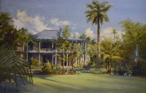 After Liliʻuokalani was imprisoned in the ʻIolani Palace, she was denied literature and newspapers, essentially cutting her off from her people, but she continued to compose music with paper and pencil while she was in confinement.[10] Another of her compositions was "Aloha ʻOe", a song she had written previously and transcribed during her confinement. In her writings, she says, "At first I had no instrument, and had to transcribe the notes by voice alone; but I found, notwithstanding disadvantages, great consolation in composing, and transcribed a number of songs. Three found their way from my prison to the city of Chicago, where they were printed, among them the 'Aloha ʻOe' or 'Farewell to Thee', which became a very popular song."[10] Originally written as a lover's good-bye, the song came to be regarded as a symbol of, and lament for, the loss of her country. Today, it is one of the most recognizable Hawaiian songs.[128][131][132]