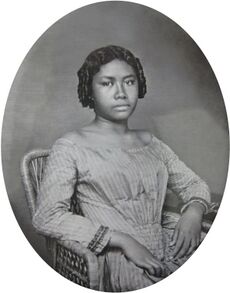 After the boarding school was discontinued in 1850, Liliʻuokalani lived with her hānai parents at Haleʻākala, which she referred to in later life as her childhood home. Around this time, her hānai sister Pauahi married the American Charles Reed Bishop against the wishes of their parents but reconciled with them shortly before Pākī's death in 1855. Kōnia died two years afterward and Liliʻuokalani came under the Bishops' guardianship. During this period, Liliʻuokalani became a part of the young social elite under the reign of Kamehameha IV who ascended to the throne in 1855.[20] In 1856, Kamehameha IV announced his intent to marry Emma Rooke, one of their classmates. However, according to Liliʻuokalani, certain elements of the court argued "there is no other chief equal to you in birth and rank but the adopted daughter of Paki",[10][note 3] which infuriated the King and brought the Queen to tears. Despite this upset, Liliʻuokalani was regarded as a close friend of the new Queen, and she served as a maid of honor during the royal wedding alongside Princess Victoria Kamāmalu and Mary Pitman.[22] At official state occasions, she served as an attendant and lady-in-waiting in Queen Emma's retinue. Visiting British dignitaries Lady Franklin and her niece Sophia Cracroft noted in 1861 that the "Honble. Lydia Paki" was "the highest unmarried woman in the Kingdom".[23]