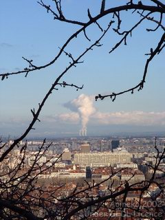 A photograph from Fourvière showing the Bugey Nuclear Power Plant in the distance, 30 km away.