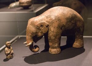 Although the site has been looted in ancient times, archaeologists still unearthed more than ten thousand artifacts: gold, bronze vessels, weapons, a zither with jade pegs, lamps of various shapes, a silver basin inscribed with the name of the Kingdom of Jiangdu, and a kitchen with food.[4] Other findings include a treasury holding more than 100,000 banliang coins, and dozens of model chariots and several life-sized ones.[4]