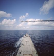 The GQM-163A Coyote flies over the bow of the U.S. Navy observation ship during a routine test