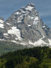 ماترهورن Matterhorn[note 3] هو أحد أشهر قمم جبال الأبنين بسلسلة جبال الألب. يبلغ ارتفاعها 4,478م عند الحدود الفاصلة لفاليس في سويسرا ومنطقة بيدمونت الإيطالية، وتقع على مسافة 65 كم شرقي مون پلان. ترتفع قمة ماترهورن كأنها هرم بالنسبة للجبال المحيطة بها، ودائمًا ما تغطي الثلوج منحدراتها العليا. وقد تسلق كثير من محترفي تسلق الجبال جوانبها الشاهقة الحادة الانحدار. وكان أول من قام بهذا التسلق الخطر لقمة ماترهورن الإنجليزي إدوارد ويمبر عام 1865.[note 4] It is a large, near-symmetric pyramidal peak in the extended Monte Rosa area of the Pennine Alps, whose summit is 4،478 متر (14،692 ft) above sea level, making it one of the highest summits in the Alps and Europe.[note 5] Sometimes referred to as the "Mountain of Mountains" (German: Berg der Berge),[5] it has become an indelible emblem of the Alps and is claimed to be the most photographed mountain in the world.[6] The Matterhorn has four faces, each roughly oriented toward one of the four cardinal points. Three of these (north, east, and west) are on the Swiss side of the border and watershed, while the south face lies on the Italian side.[7][8] These four steep faces, rising above the surrounding glaciers, are separated by the Hörnli, Furggen, Zmutt, and Leone (Lion) ridges. The mountain overlooks the Swiss town of Zermatt, in the canton of Valais, to the northeast, and the Italian town of Breuil-Cervinia in the Aosta Valley to the south. Just east of the Matterhorn is Theodul Pass, the main passage between the two valleys on its north and south sides, which has been a trade route since the Roman era.