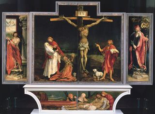 ![]() الرسام ماتياس گرونڤالد (1470-1528). لوحة "مذبح إيزنهايم"، وتصور أنتوني الأكبر والقديس سباستيان وأغسطين من هيپو وپولس الرسول. رُسمت في 1512. |